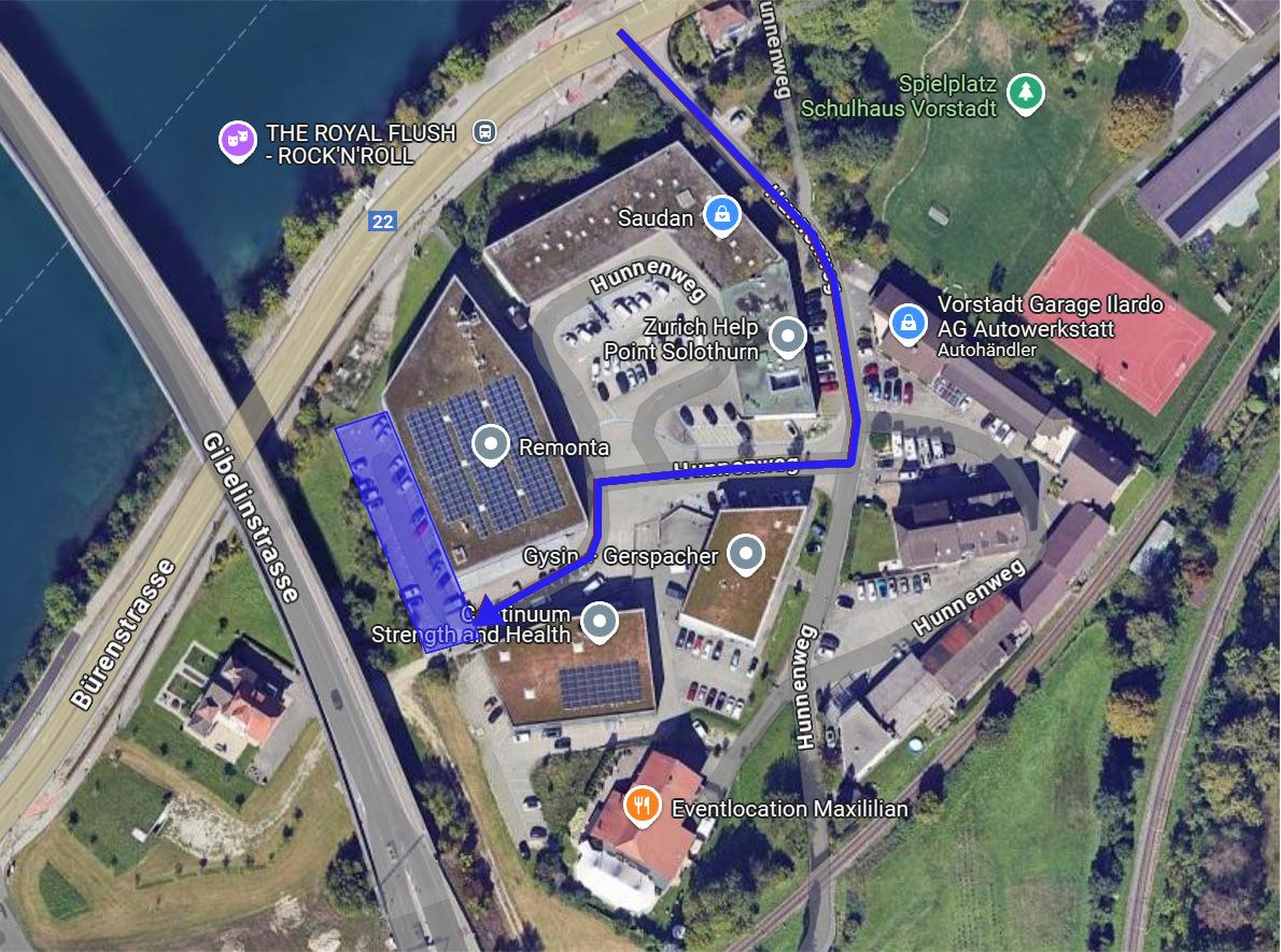 und in Solothurn aussteigen. Fussweg 20 Minuten bis zur Location.